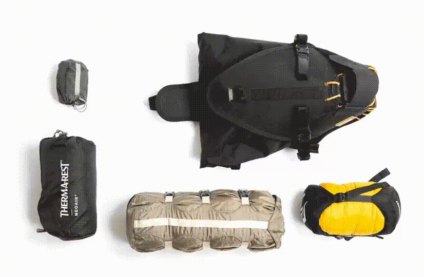 FINALLY, THE BAR BAG IS A GREAT PLACE TO HOLD THE REST OF THE GEAR THAT YOU DON’T PLAN ON TOUCHING WHILE RIDING. ANY SPARE CLOTHING, COOKING SUPPLIES, EXTRA CHARGING EQUIPMENT, WASH-KIT, CAMP-FOOD. THE DOUBLE-ENDED DRY-BAG THAT COMES WITH THE BAR BAG MEANS THAT YOU CAN STASH EXTRA LAYERS ON EITHER SIDE TO MAKE THEM EASY TO GRAB ON THE SIDE OF THE TRAIL.